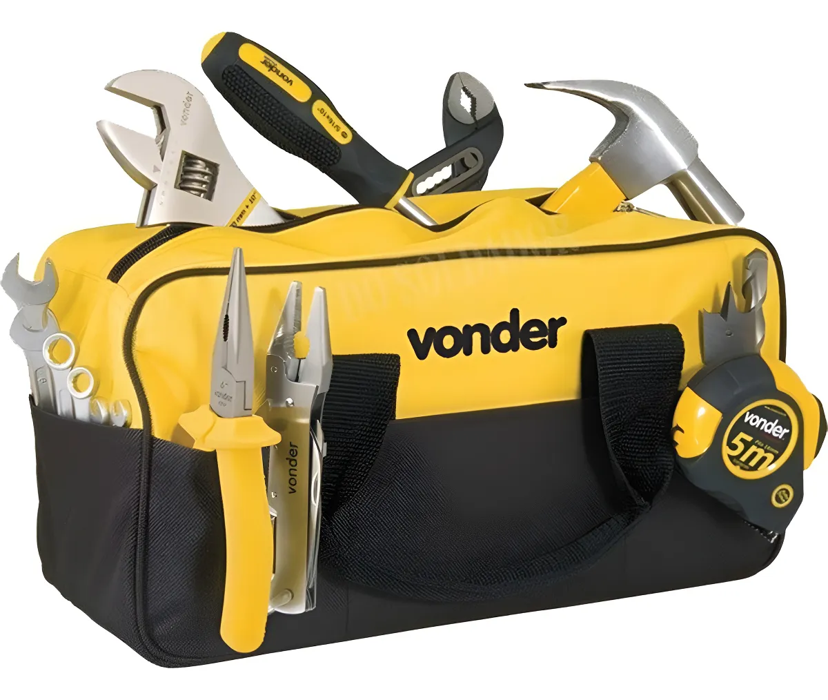 Com alças em nylon resistentes e fechamento por zíper, garante segurança no transporte e praticidade no uso. Seu design em amarelo e preto, tradicional da linha Vonder, combina estilo e funcionalidade para eletricistas, encanadores, montadores e profissionais em geral.